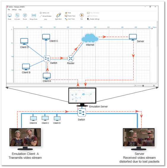 A real PC (running NetSim Emulation Client) sends live traffic to the PC (running NetSim Emulation Server). Whenever a packet arrives at the interface of server, this packet is “converted” into a simulation packet and sent from a source node (user selectable) in the simulated network (user configurable) to a destination node (again user selectable). Upon receipt of this packet at the destination, the packet is then “re-converted” and sent back to a real PC destination node (running NetSim Emulation Client). The real packet thus undergoes network effects such as delay, loss, error etc. created virtually by NetSim Simulator.