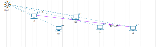 Configure the CBR application between two nodes by clicking on the set traffic tab from the ribbon at the top, selecting N1 as the source and N2 as the destination. Click on the created application and set the transport protocol to UDP, keeping the other properties as default.