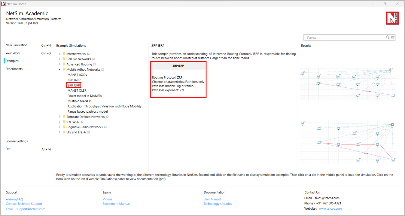 Open NetSim and Select Examples -> Mobile Ad hoc Networks -> ZRP IERP then click on the tile in the middle panel to load the example as shown in below screenshot Figure-9.