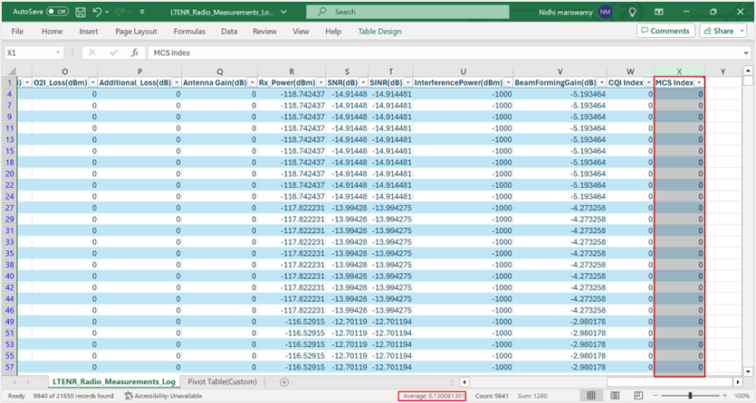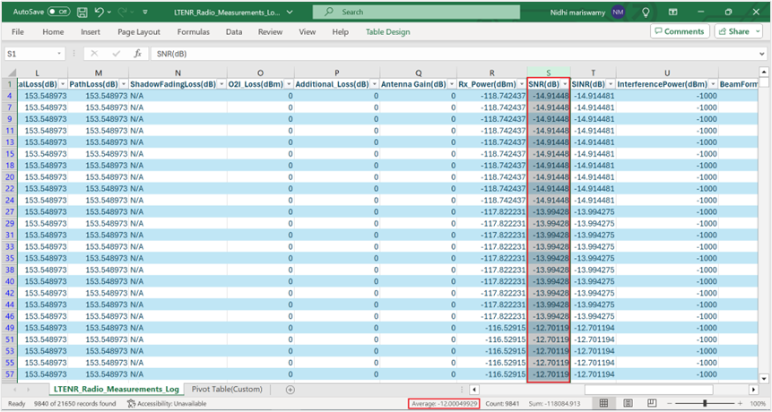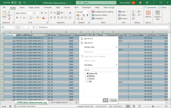 Figure-78: LTENR Radio Measurements Log file pivot table showing the filtering process of DL/UL column