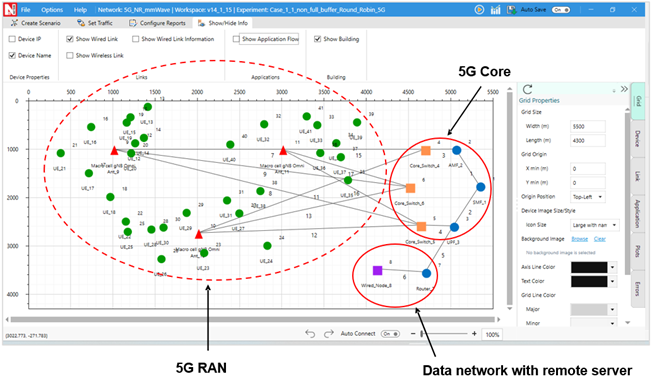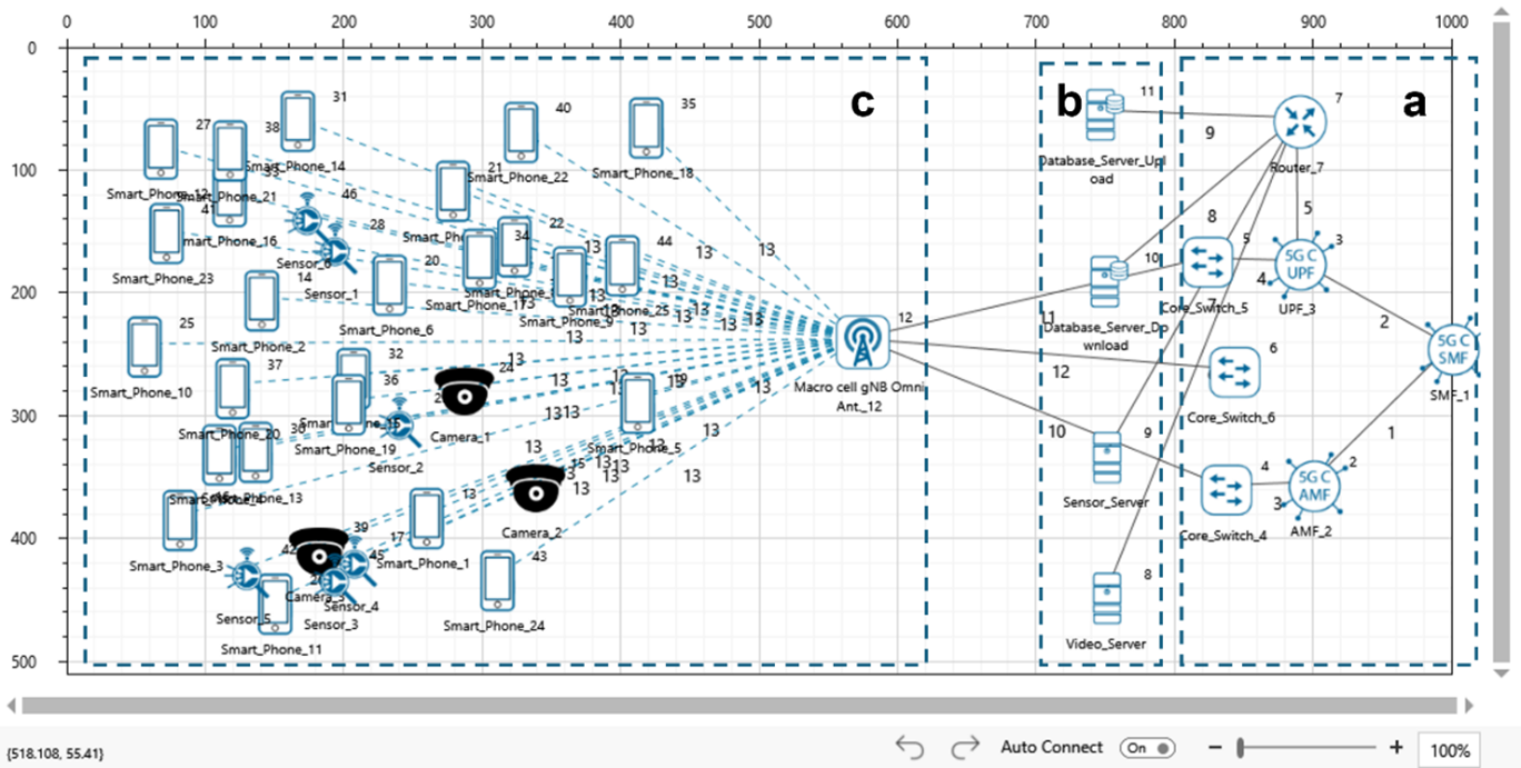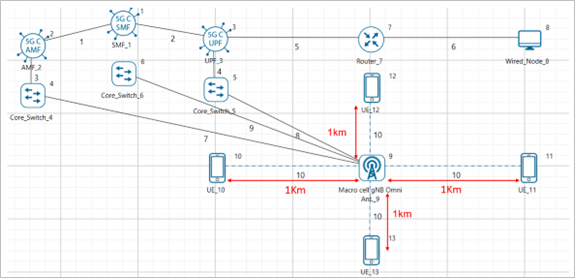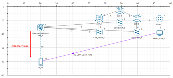 NetSim UI would display the network topology shown in the screenshot below when you open the example configuration file.