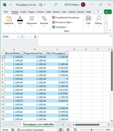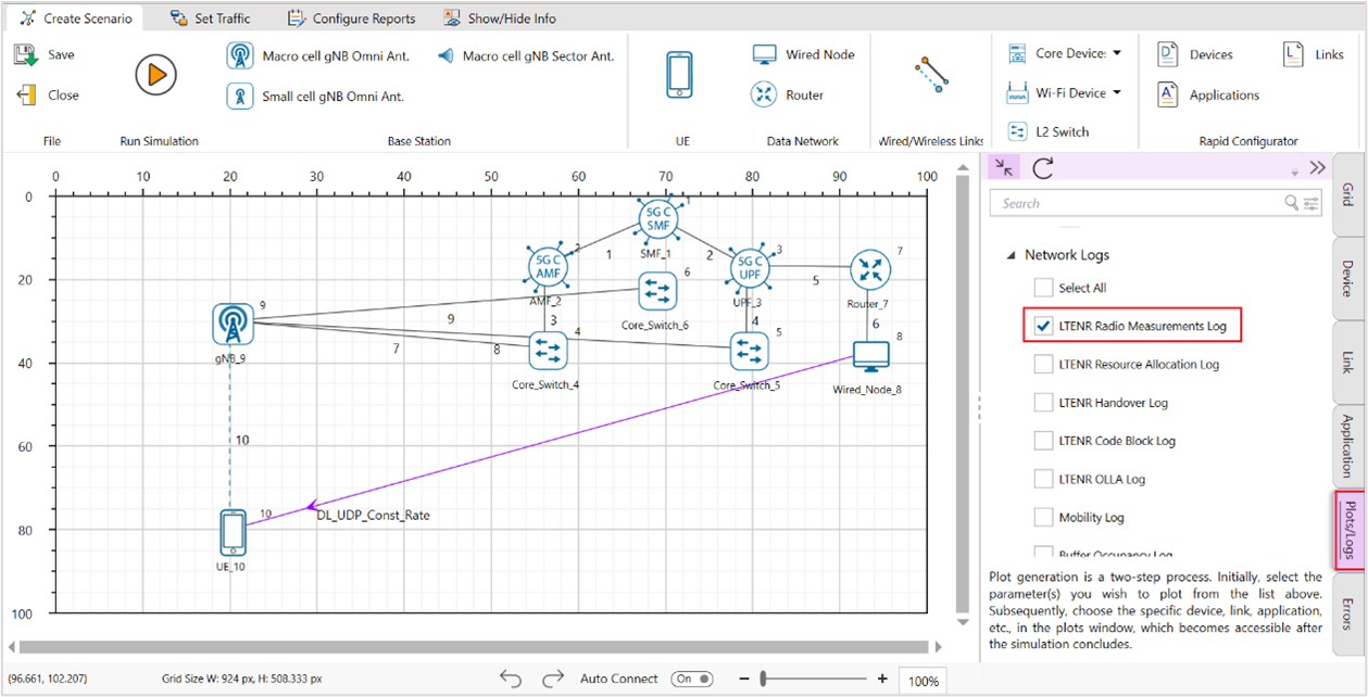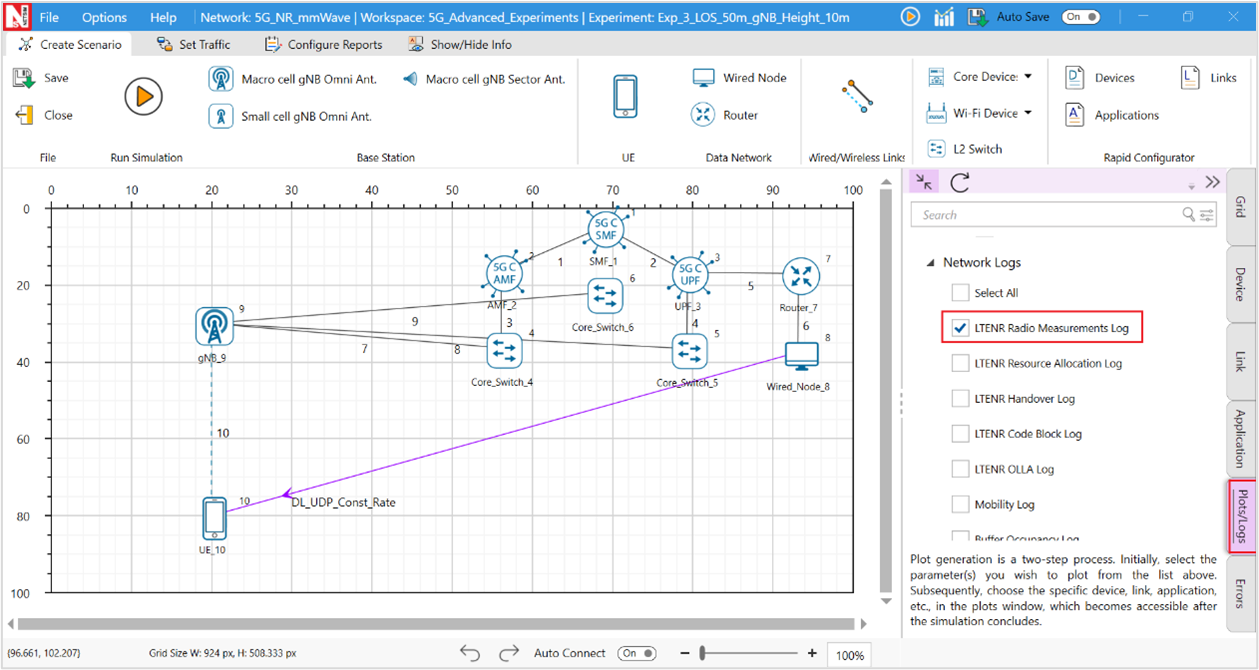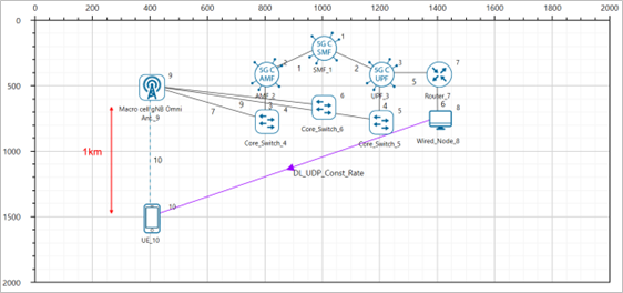 A downlink CBR application was configured from wired node to UE with Transport protocol as UDP and Packet Size of 1460 Bytes and Inter Arrival time of 179.69 µs and the Start Time was set to 1s.