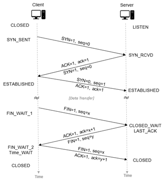 During the life of a TCP connection, the TCP protocol running in each host makes transitions through various TCP states. Figure-1 illustrates the typical TCP states visited by the client and the server during connection establishment and data communication.
