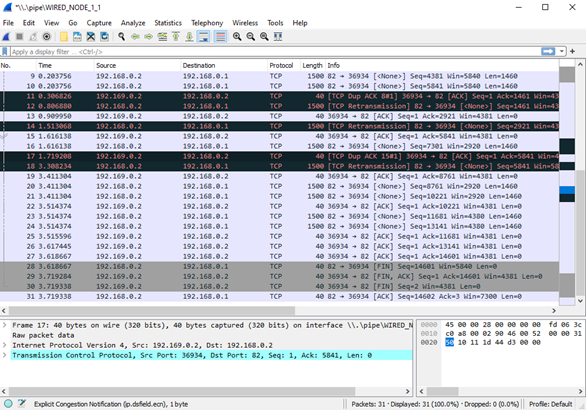 Figure-11: PCAP file at Wired Node 1. TCP ensures reliable data transfer using timeout, duplicate ACKs and retransmissions.