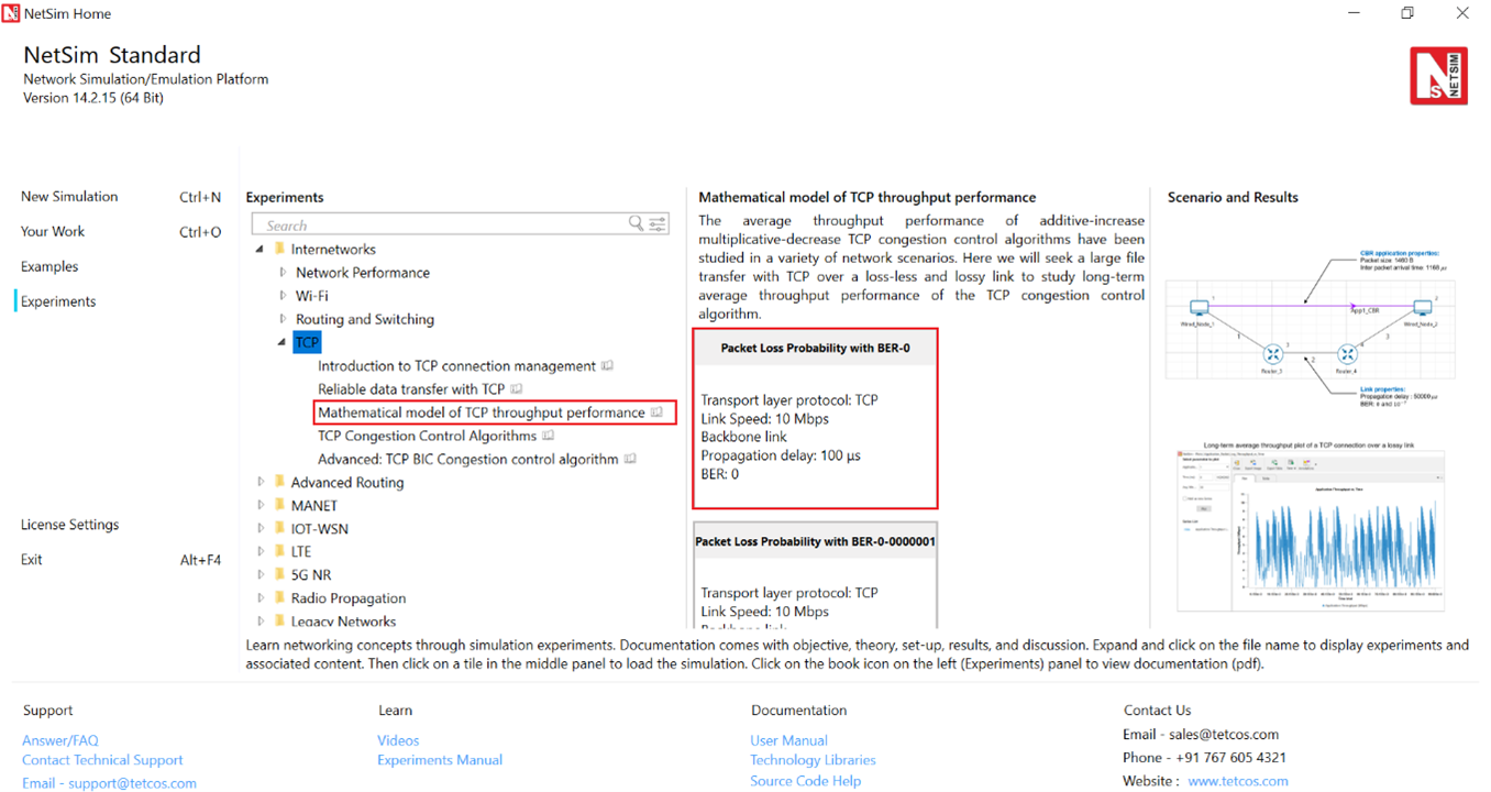 Open NetSim and click on Experiments> Internetworks> TCP> Mathematical model of TCP throughput performance then click on the tile in the middle panel to load the example as shown below in Figure-13.