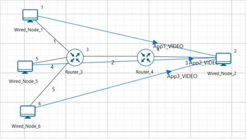 Step 5: Configure CBR application between Wired node 1 and Wired node 2 by clicking on Set traffic tab from the ribbon on top. To configure application properties, click on created application and set the Packet Size to 1460 Bytes and Inter Arrival Time to 1168 microseconds by keeping the transport layer to TCP.