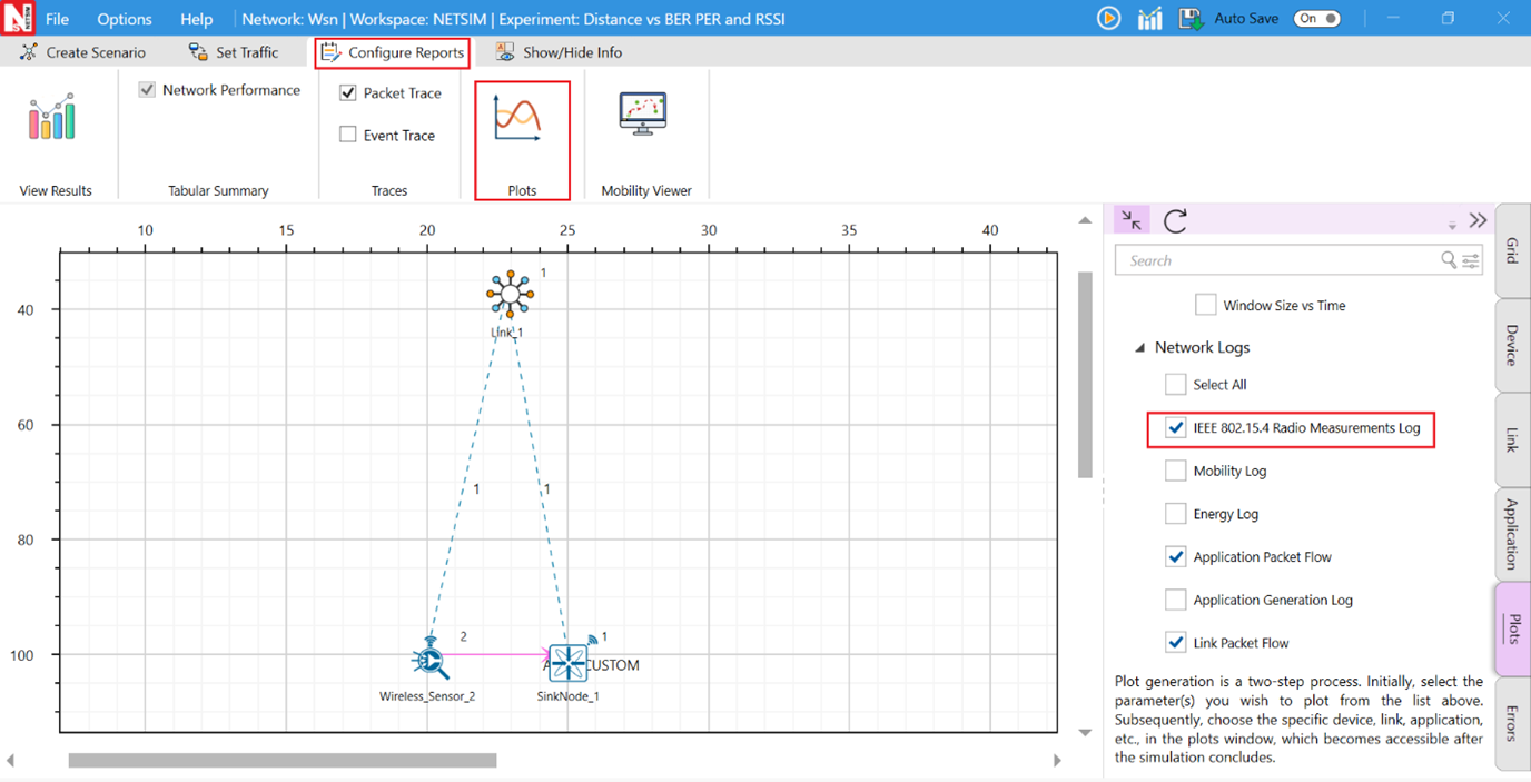 Step 1: A network scenario is designed in NetSim GUI comprising of 2 Wireless Sensors and a WSN Sink in the “Wireless Sensor Networks” Network Library.
