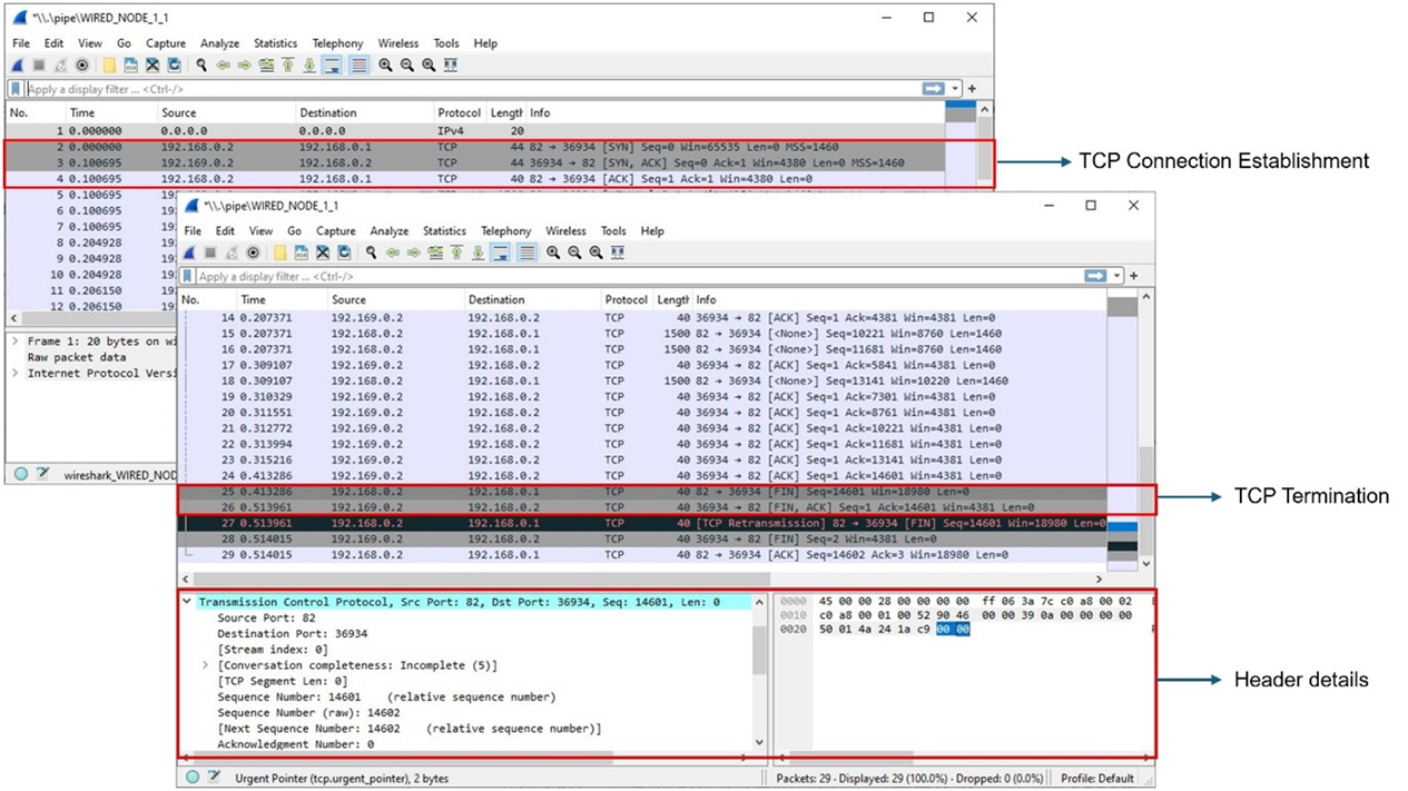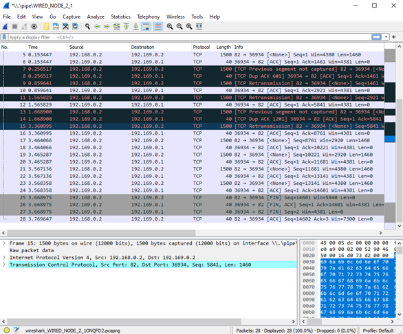 Figure-11: PCAP file at Wired Node 1. TCP ensures reliable data transfer using timeout, duplicate ACKs and retransmissions.