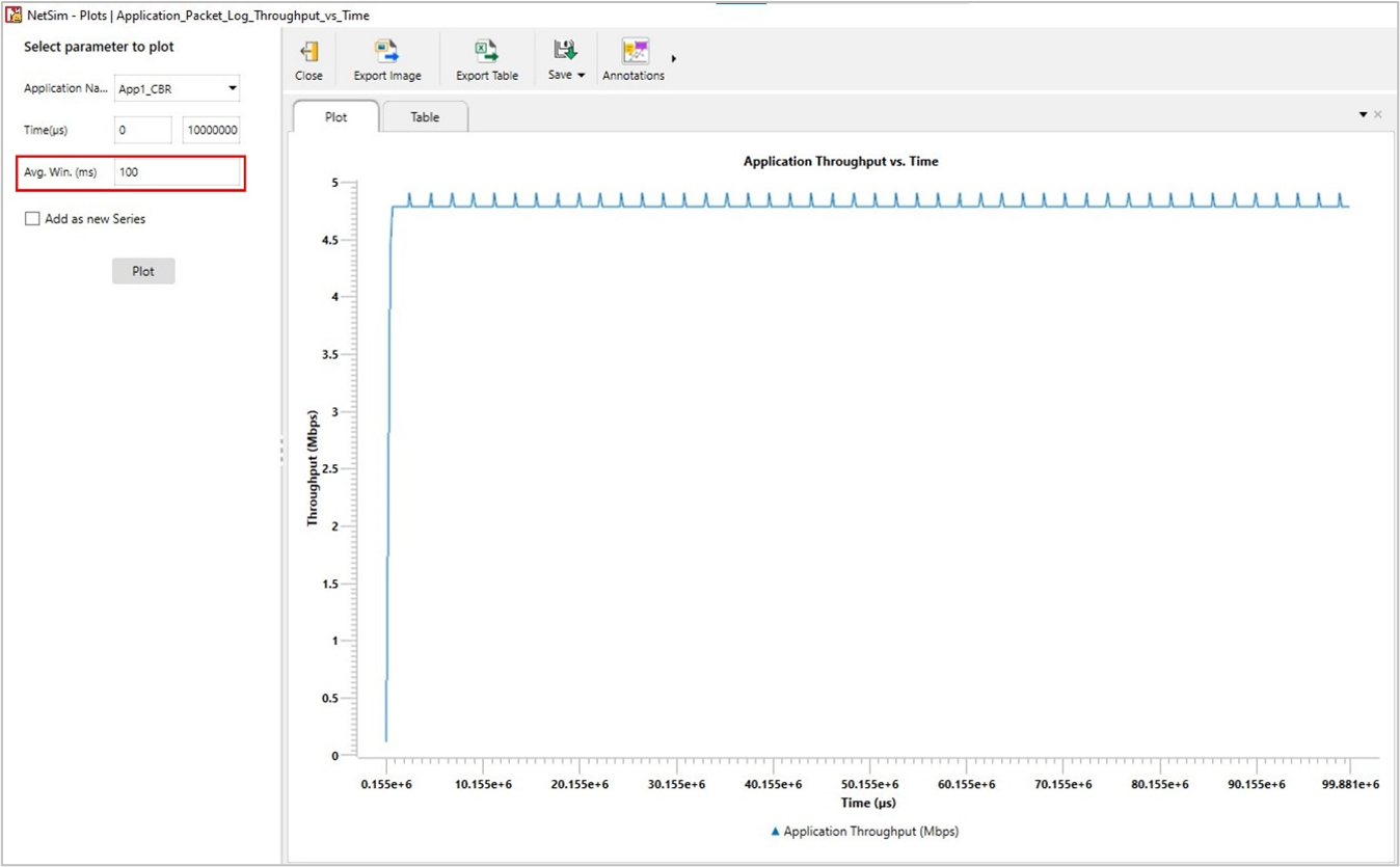 Step 6: Enable Application throughput vs time plot from NetSim UI. This enables us to view the throughput plot of the application App1 CBR.