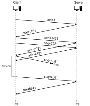 Figure-7: An illustration of TCP retransmission with timeout. The segment with sequence number 4381 is lost in the network. The TCP client retransmits the segment after a timeout event.