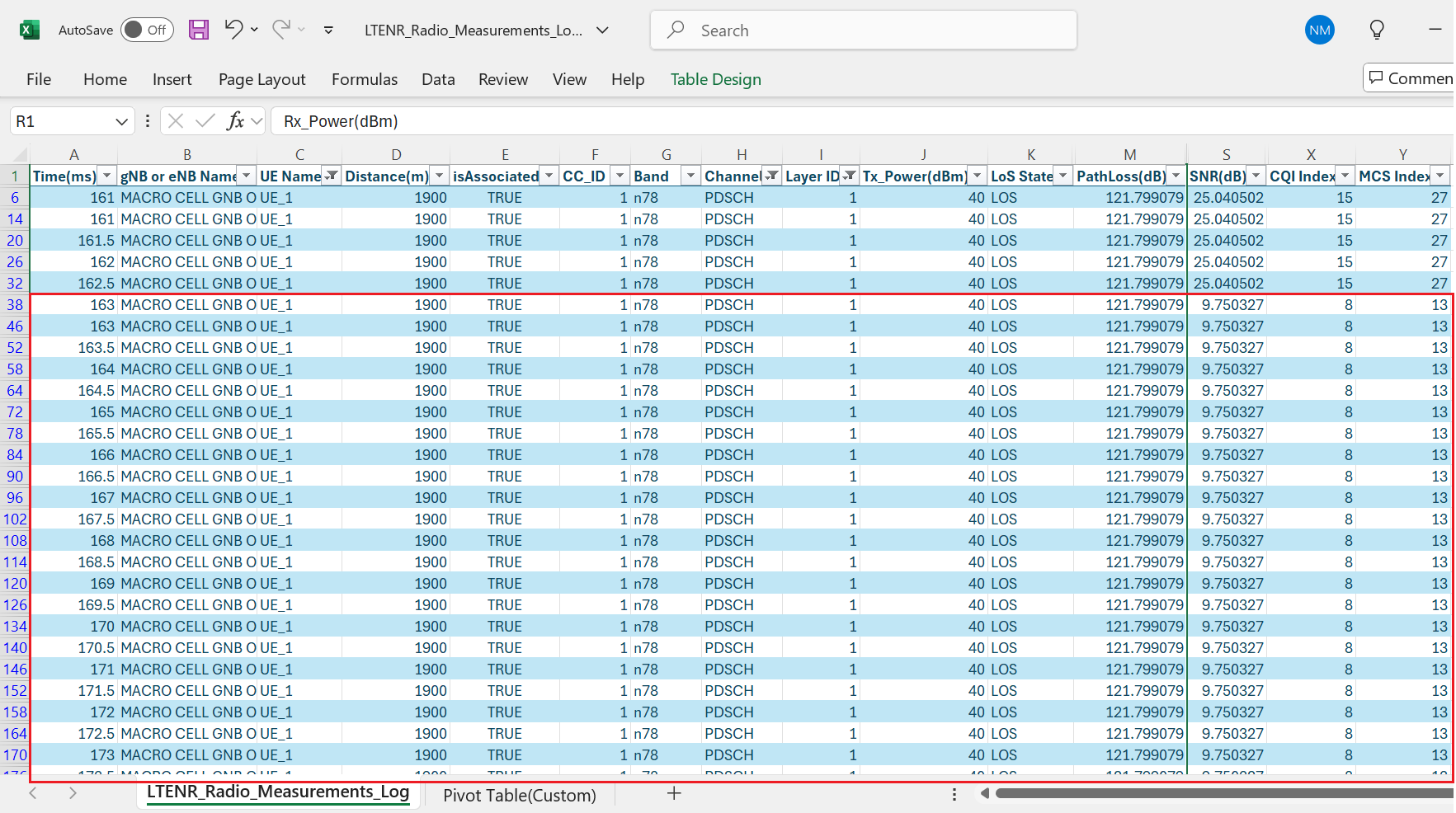 Open LTENR Radio measurement log from simulation results window and filter the channel to PDSCH, Layer ID to 1, To observe the MCS, CQI, Pathloss and SNR values for UE 1, filter the UE ID to UE 1