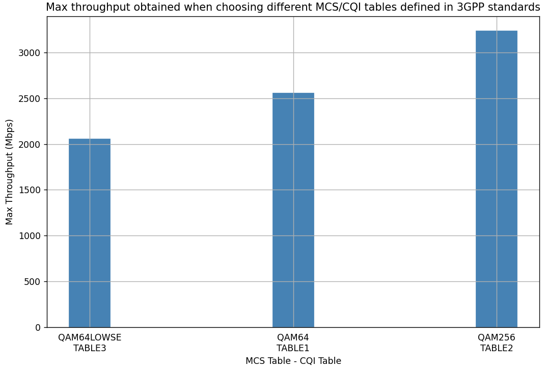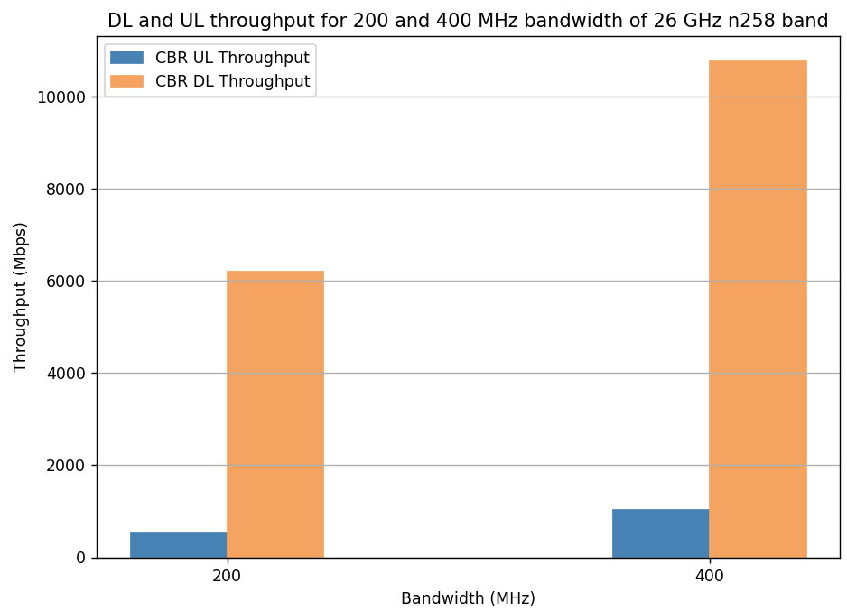 The computation of the PHY layer packet size is complex. It involves various layers adding overheads: the Transport layer (UDP) contributes 8 B, and the Network Layer (IP) adds 20 B. The MAC layer introduces additional overhead, with the SDAP header contributing 1B and the PDCP header adding 16B. At this point, the packet size is the size of the application layer packet plus 45 B. The MAC layer in 5G further processes these packets, fitting them into transport blocks (TBs). These TBs are then divided into code blocks (CBs), which are grouped into code block groups (CBGs) for transmission over the air. The sizes of the TB and CB depend on various parameters, and additional overheads are incurred during this process. As a result, it’s challenging to provide a simple analytical formula for PHY layer packet size. A reasonable estimate would be about 5–10% reduction between the PHY rate and the application throughput. This is what we observe when we compare the simulation results with the theoretical predictions in the above table.
