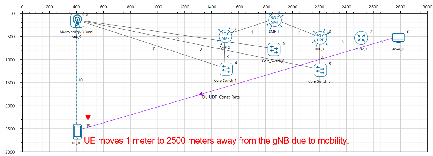 The experiment aims to analyze how the performance of a UE changes as it moves away from its serving gNB. In real-world scenarios, users are mobile, and their distance from the base station affects signal strength. By simulating a linear movement of the UE away from the gNB, we can observe how parameters such as pathloss, SINR, and MCS change with distance. This helps determine the coverage limit of the gNB, identify when the signal is no longer sufficient for communication, and plan for handover decisions.