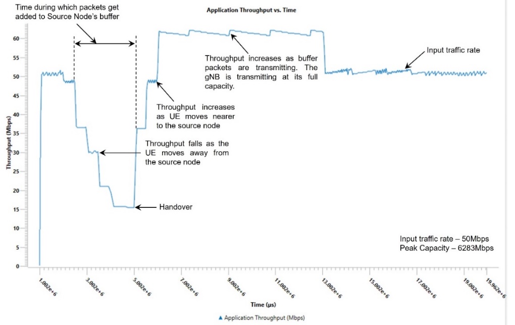 The multi-parameter sweeper runs a total of 28 simulations, varying handover margin from 0 to 6 dB and time to trigger from 128, 256, 512, 1024 for all gNB’s. It generates an output file named “result.csv” which stores sum throughputs of all applications and the handover count. (It took us approximately 4 hours to complete all 28 simulations; we used a machine with a i5 processor and with 8 GB RAM).
