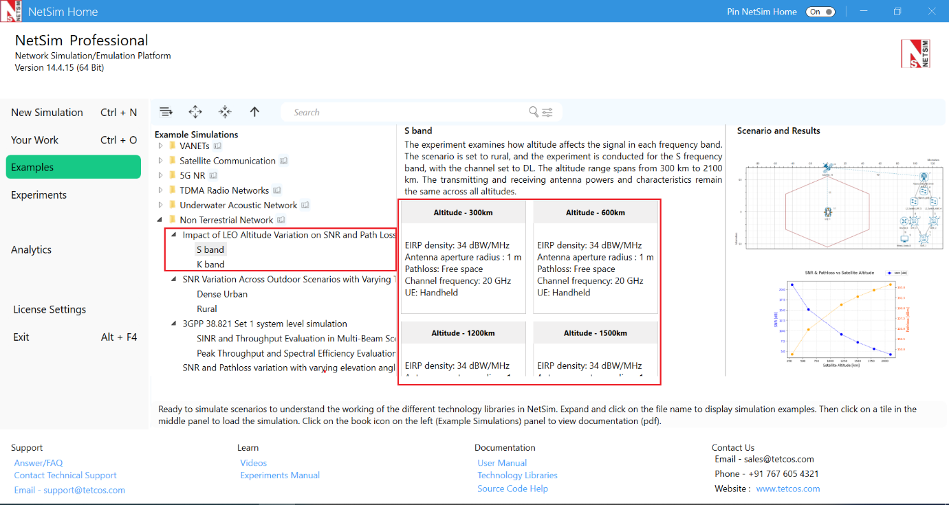 To simulate this example in NetSim, Open NetSim, Select Examples \(\triangleright\) Non Terrestrial Network \(\triangleright\) Impact of LEO Altitude Variation on SNR and Path Loss then click on the tile in the middle panel to load the example as shown in below screenshot.