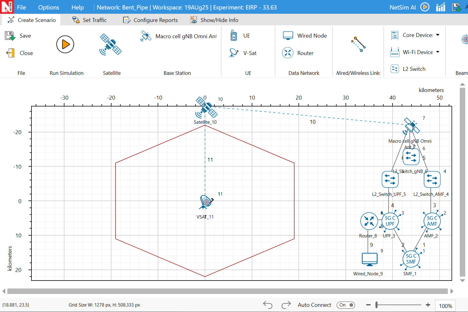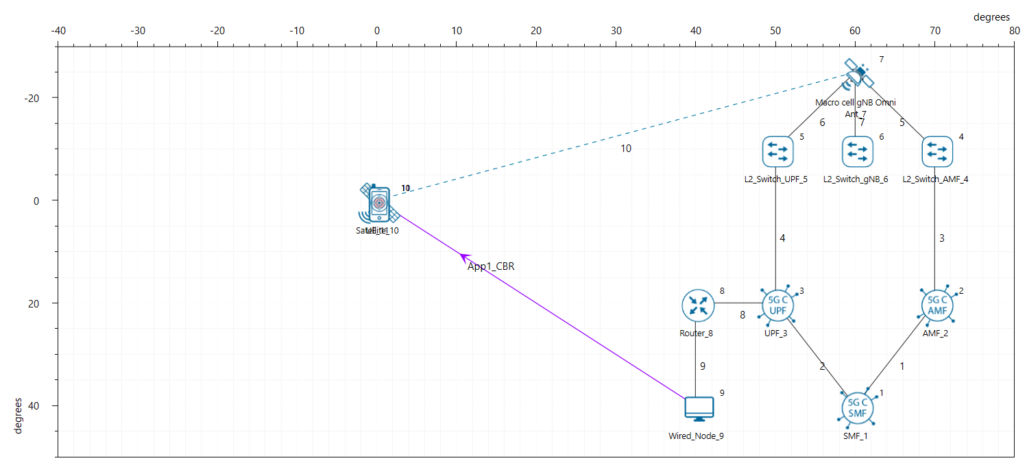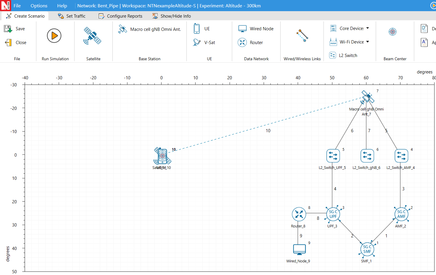 This simulation is based on the Set 1 Reference Scenario from 3GPP TR 38.821, which provides guidelines for evaluating the performance of Non-Terrestrial Networks (NTN) with Low Earth Orbit (LEO) satellites. In this setup, the satellite uses a transparent payload, meaning it acts as a relay, passing signals between the ground gateway and the User Equipment (UE).
