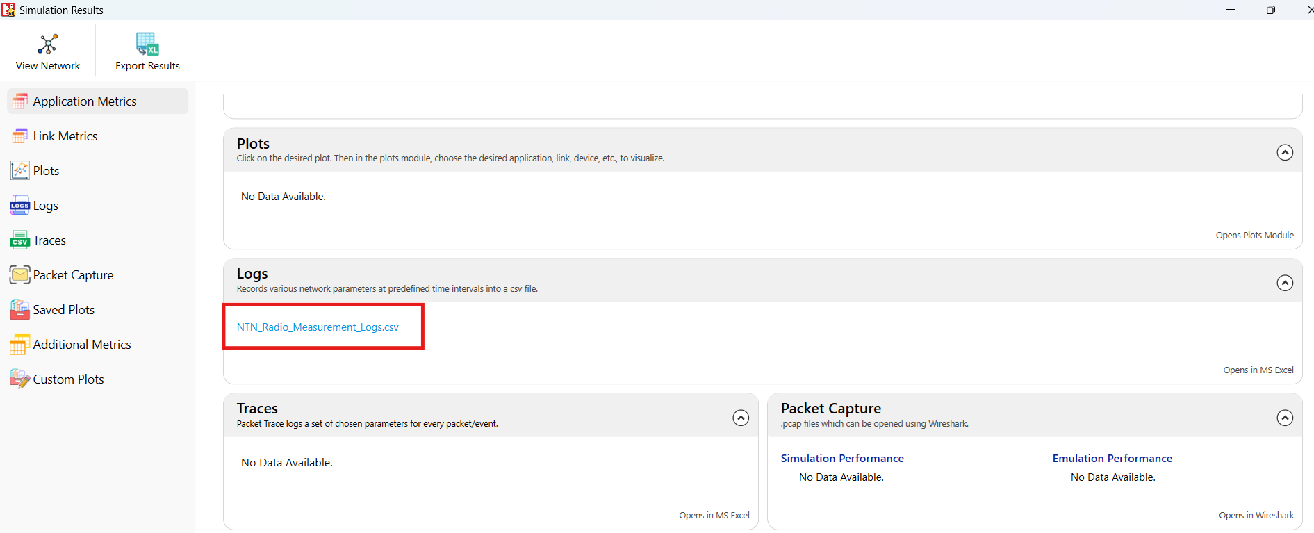 Run simulation for 30s, after the simulation completes, go to results window click on logs options and open NTN Radio Measurement Log.csv, note down the SINR, and from the Application packet flow log note down the Throughput for each application.