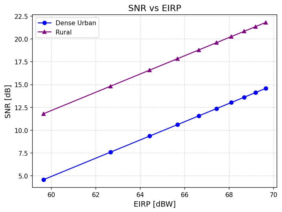 The Ka band, which operates at higher frequencies, experiences greater path loss as can be seen from the example numerical calculation provided. In downlink transmissions, the SNR values for the S-band and K-band cases are comparable. Although the K-band scenario has higher path loss and lower EIRP input, the use of V-SAT antennas with a receiver gain of 35 dBi compensates for these effects, whereas the S-band scenario uses simulated handheld UEs with nil receiver gain.