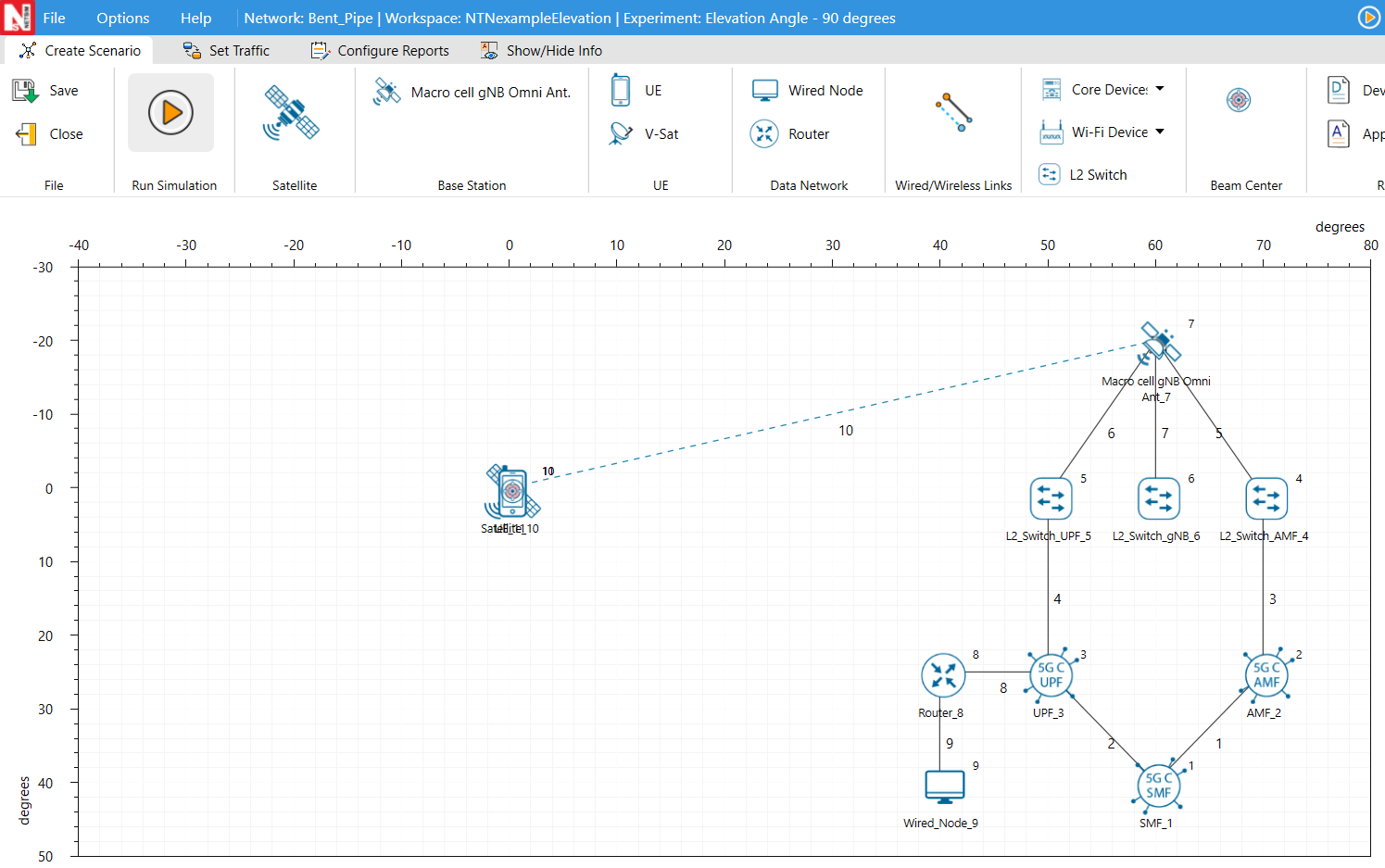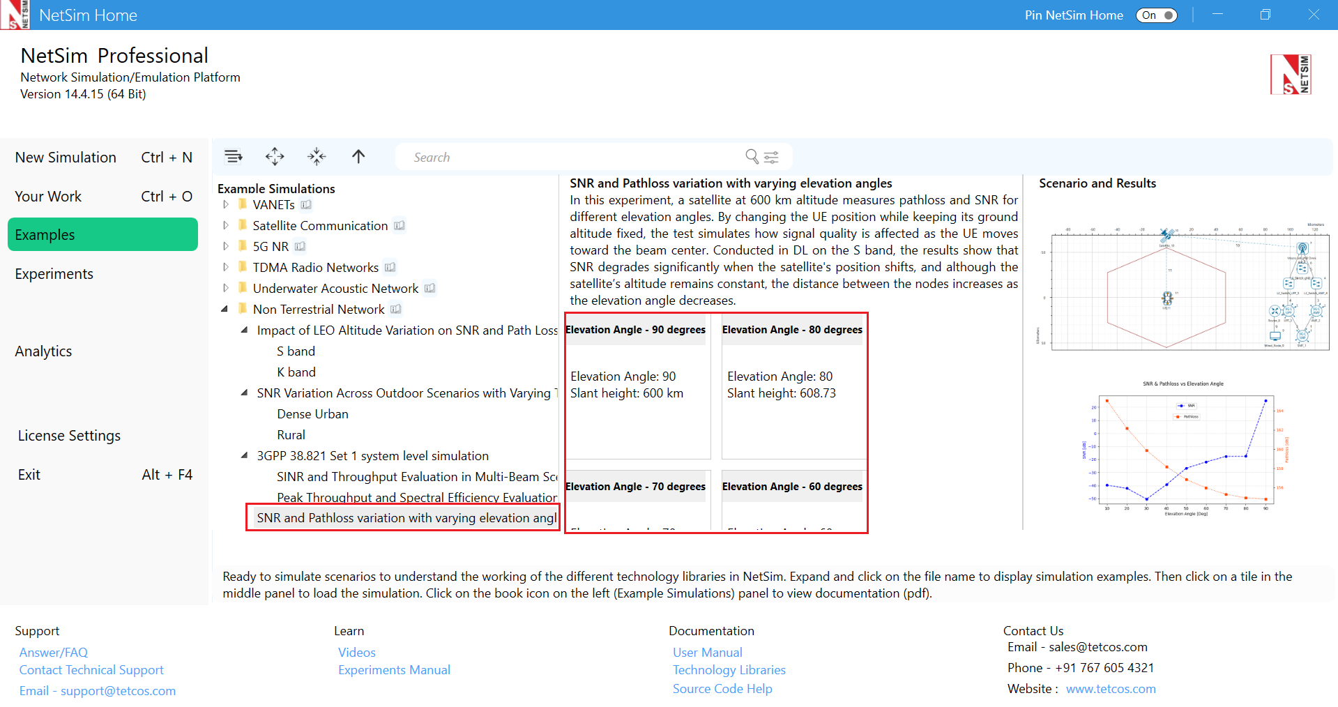To simulate this example in NetSim, Open NetSim, Select Examples \(\triangleright\) Non-Terrestrial Network \(\triangleright\) SNR and Pathloss variation with varying elevation angles then click on the tile in the middle panel to load the example as shown in below screenshot.