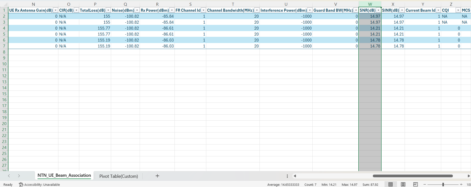 After the simulation, open the NTN UE Beam Association.csv under logs section from simulation results window and observe the SNR value.