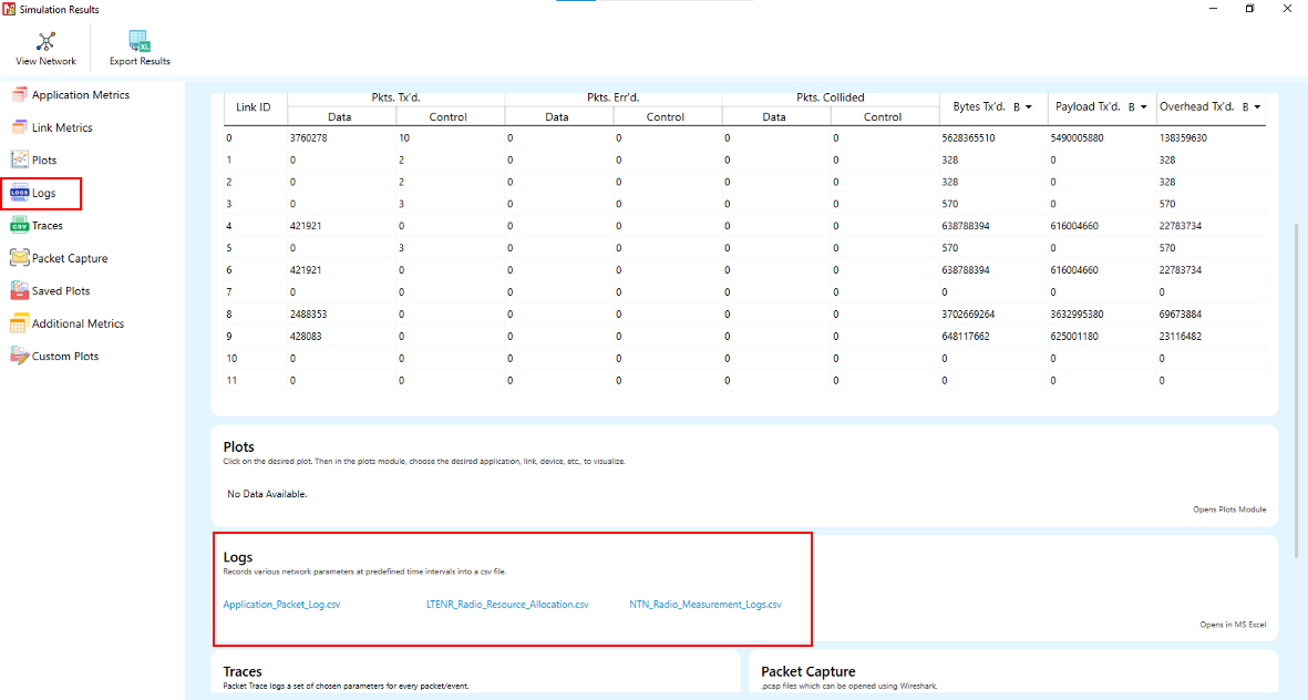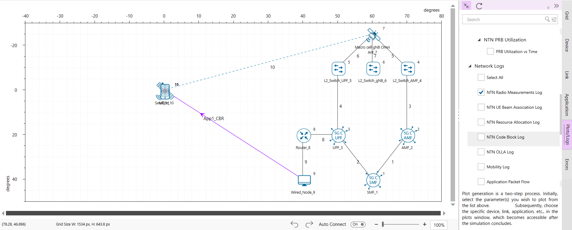 The NTN Radio measurement log, NTN Resource allocation log and Application packet flow log files must be enabled from the design window.