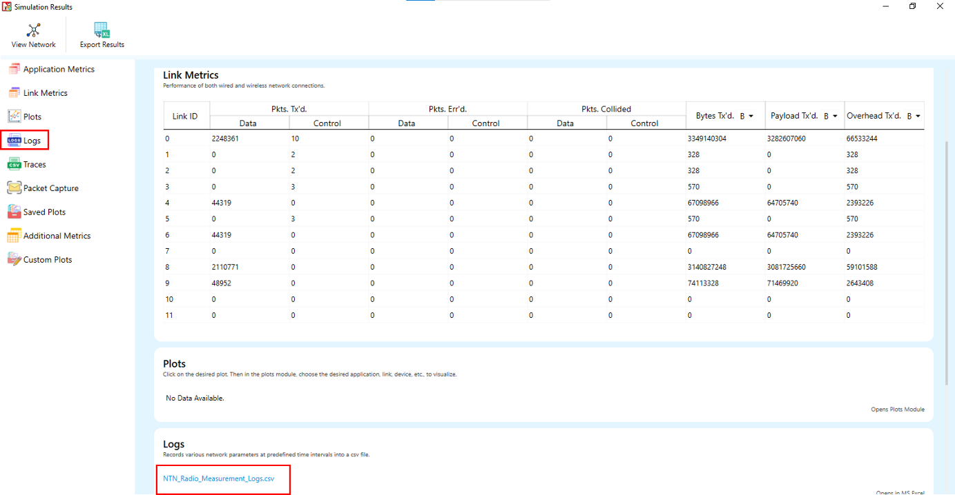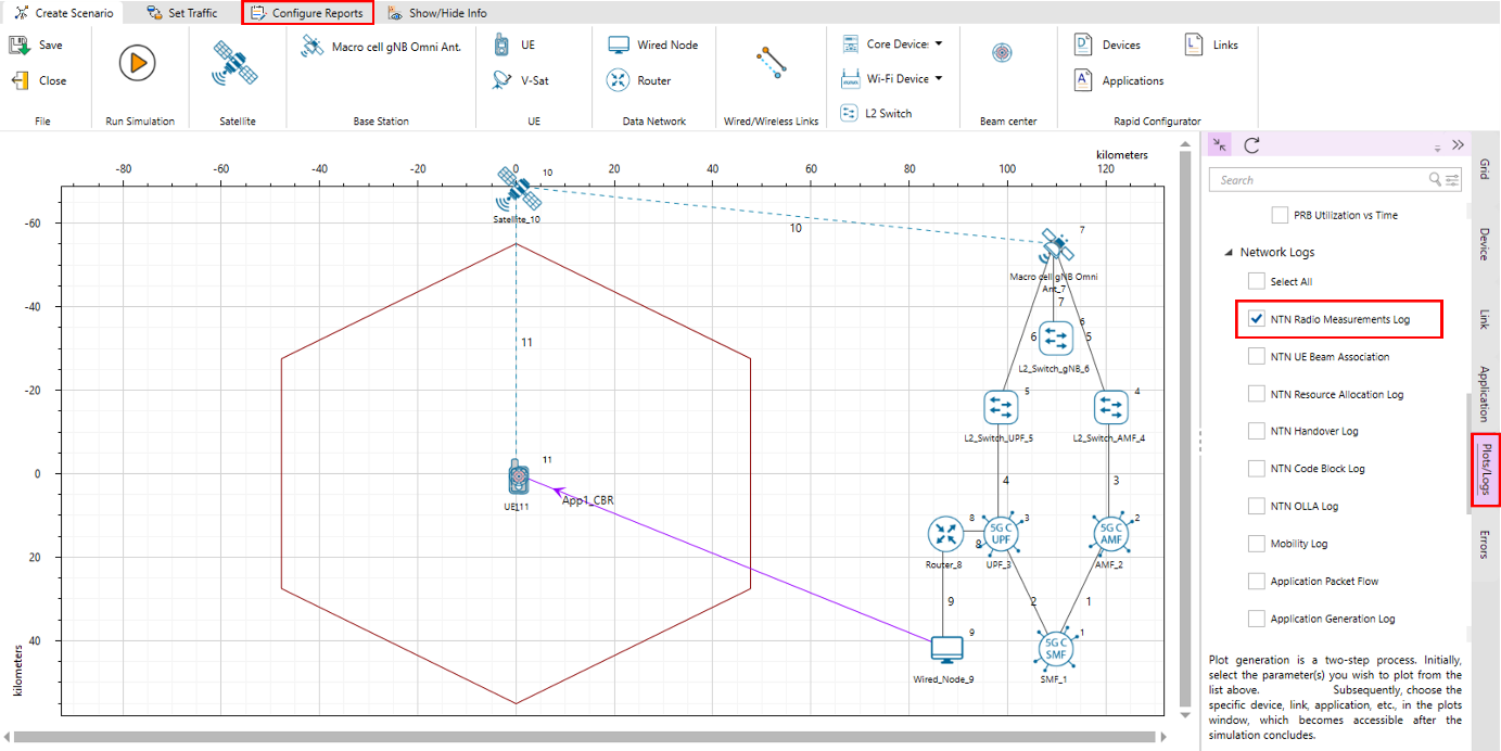 The NTN Radio Measurements log can be enabled by clicking on configure reports in top ribbon \(\triangleright\) Plots/Logs \(\triangleright\) Select NTN Radio Measurements log under Network Logs as shown below.