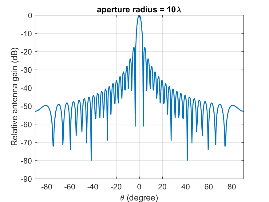 where \(J_1(x)\) is the Bessel function of the first kind and first order with argument \(x\), \(a\) is the radius of the antenna’s circular aperture, \(k =\frac{2\pi f}{c}\) is the wave number, \(f\) is the frequency of operation, \(c\) is the speed of light in a vacuum and \(\theta\) is the angle measured from the boresight of the antenna’s main beam. Note that \(ka\) equals the number of wavelengths on the circumference of the aperture and is independent of the operating frequency. The above expression provides the gain in linear scale and it needs to be converted to dB scale. The normalized gain pattern for \(a = 10\frac{c}{f}\) (aperture radius of 10 wavelengths) is shown below