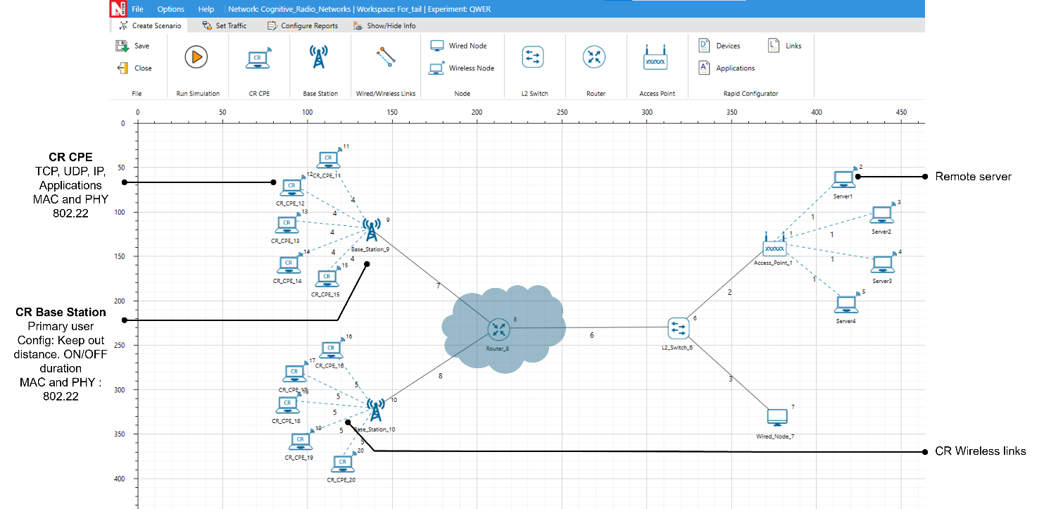 NetSim models CR by using the specifications in the IEEE 802.22 standard. Users can also connect a Cognitive Radio with Internetwork devices, use all the protocols that Internetworks support, and view packet and event traces.