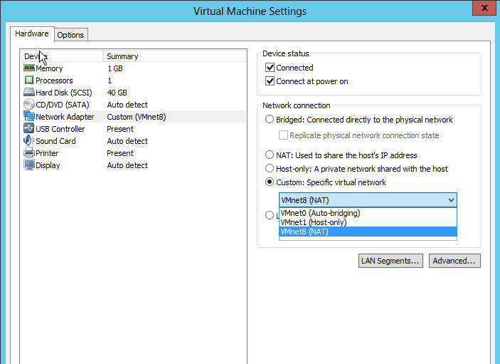 Click on Network Adapter, and select “Custom: Specific Virtual network”