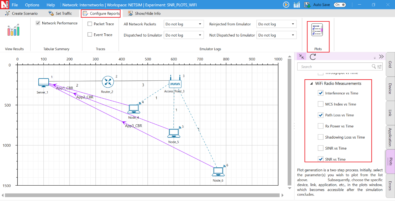 NetSim provides protocol-specific logs for Internetworks libraries, which users can enable before running a simulation. These can be enabled by navigating to the Configure Reports section in the top ribbon, selecting Plots, choosing the desired options, and running the simulation.