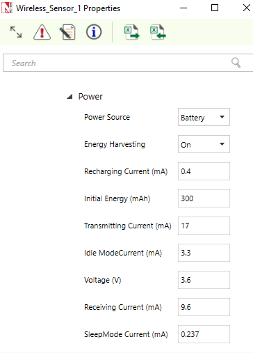 NetSim Energy log file records Current Time, Mode Switch Time, Mode, Device Name, Device Id, Voltage, Mode Current, Initial Energy, Remaining Energy, Transmit Energy, Receive Energy, Idle Energy, Sleep Energy, Harvested Energy, Consumed Energy.