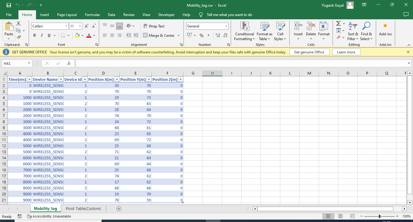 NetSim mobility log file records Time, Device Name, Device Id, Position X, Position Y, Position Z. The Mobility log can be enabled by clicking on icon present in the tool bar as shown below.