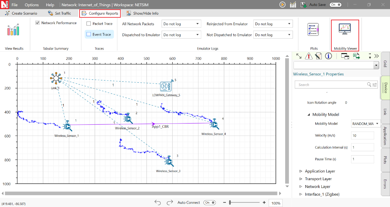 Additionally, the mobility path for sensors can be observed in the design window using mobility viewer option as shown in the screenshot below. For more details on the mobility viewer refer the user manual section 8.6.