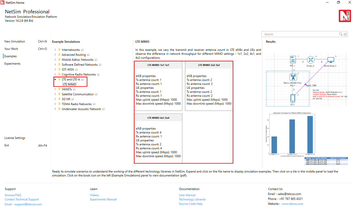 Open NetSim and Select Examples \(>\) LTE and LTE-A \(>\) LTE MIMO then click on the tile in the middle panel to load the example as shown in below screenshot.