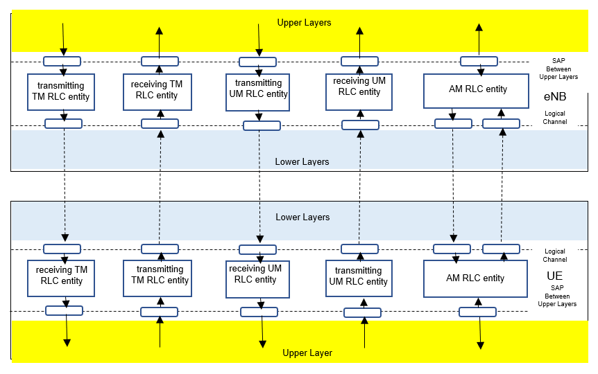 Flow of TM, UM, and AM mode between RLC upper and lower layer as shown in the figure below.