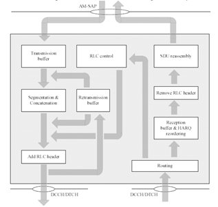At the time of RLC AM transmission, It receives the SDU (Data) from the higher layers (PDCP or RRC) and put the SDU into the transmission buffer. When the MAC permits the transmission, it segment or concatenate the SDU into RLC PDU and add the RLC header to the RLC PDU and make the copy of the transmission buffer for the possible retransmission. Then the RLC SDU sent to the next layer (MAC layer).
