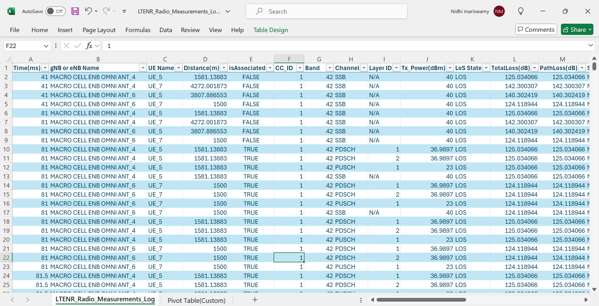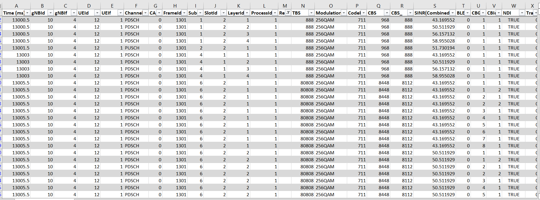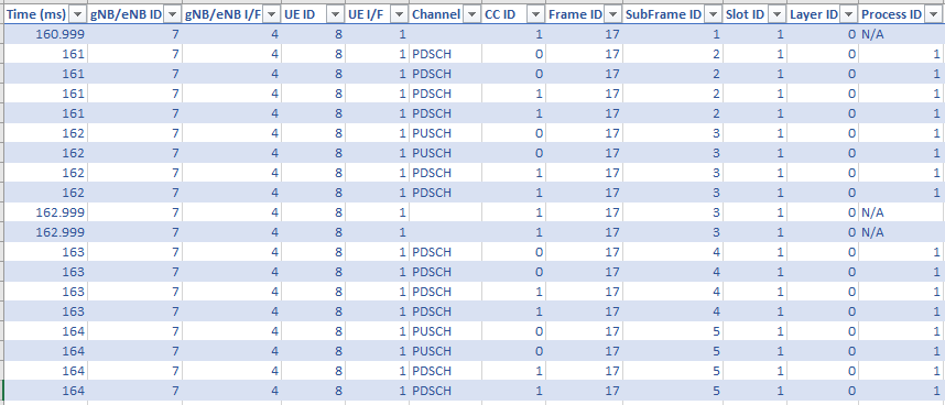 Parameters associated with PDSCH and PUSCH channels are logged at every slot only for associated gNB-UE pairs.