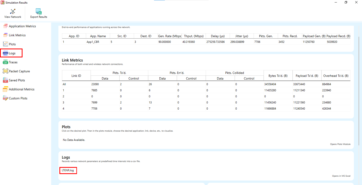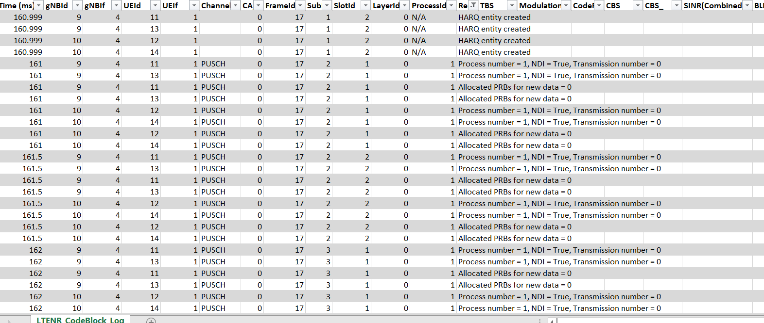 NetSim’s Code Block Log records parameters associated with Code Block Segmentation, such as Process ID, TB Size, Modulation, Code Rate, CBS, BLER, CBG ID, and more, along with remarks on events associated with HARQ and PRB allocation events. This log is useful for understanding the BLER model and Code Block Segmentation in 5G.