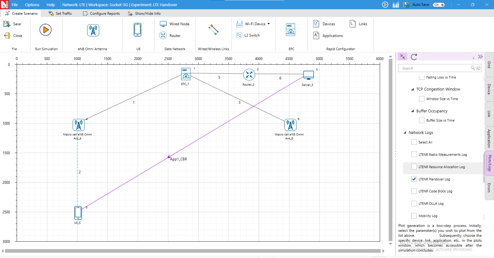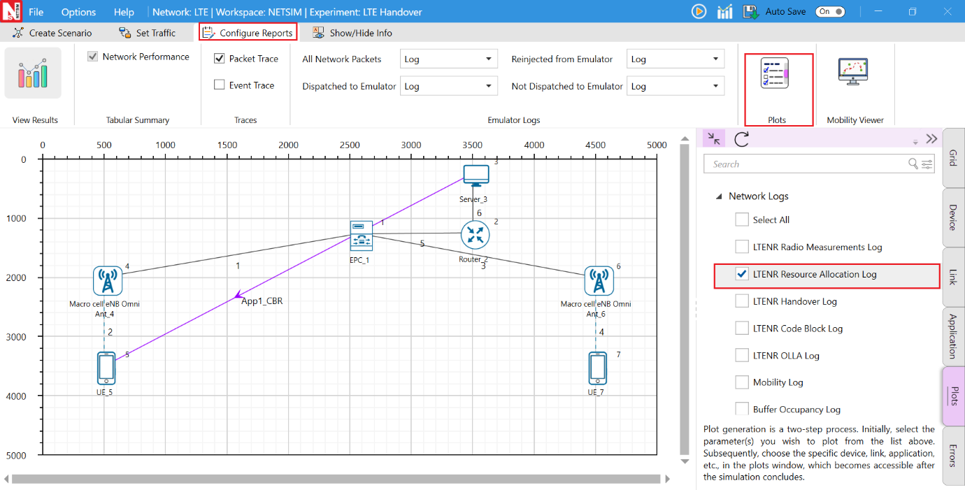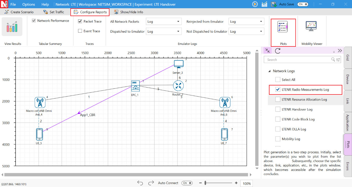The LTENR Handover Log can be enabled by clicking on Configure Reports in the top ribbon \(>\) Plots \(>\) Select LTENR Handover Log under Network Logs, as shown below.