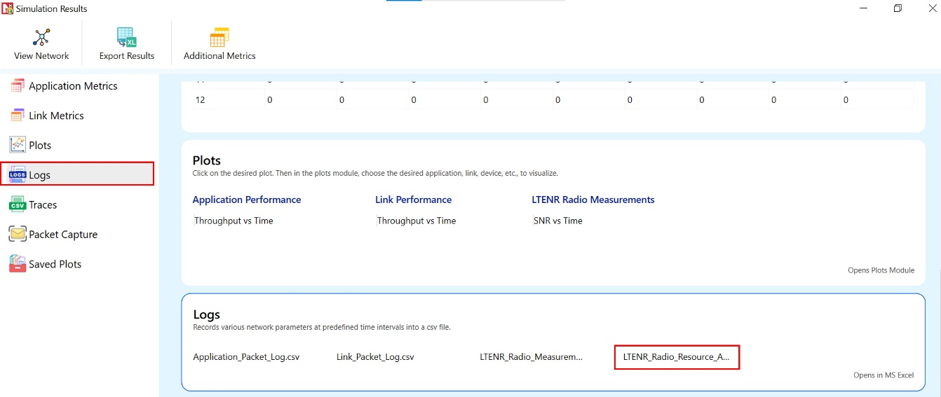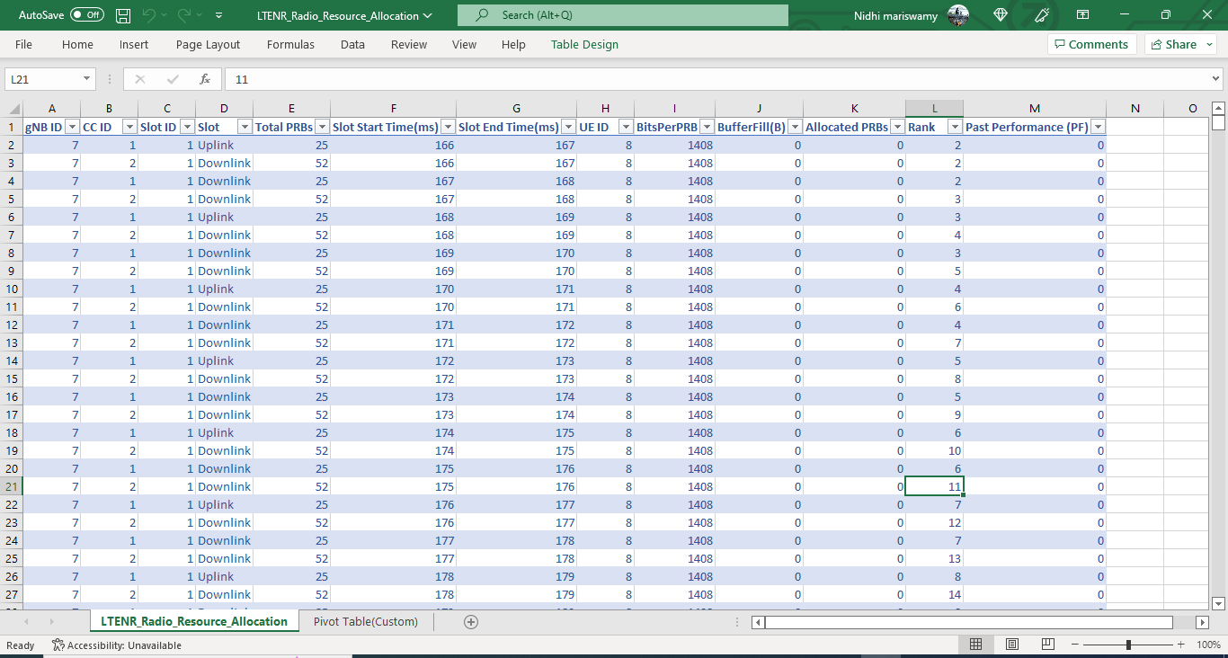 NetSim’s 5G Radio Resource Allocation CSV log file records information related to physical resource block allocation such as the Total PRBs, Slot Start Time (ms), Slot End, Bits Per PRB, Buffer Fill, Allocated PRBs, etc.