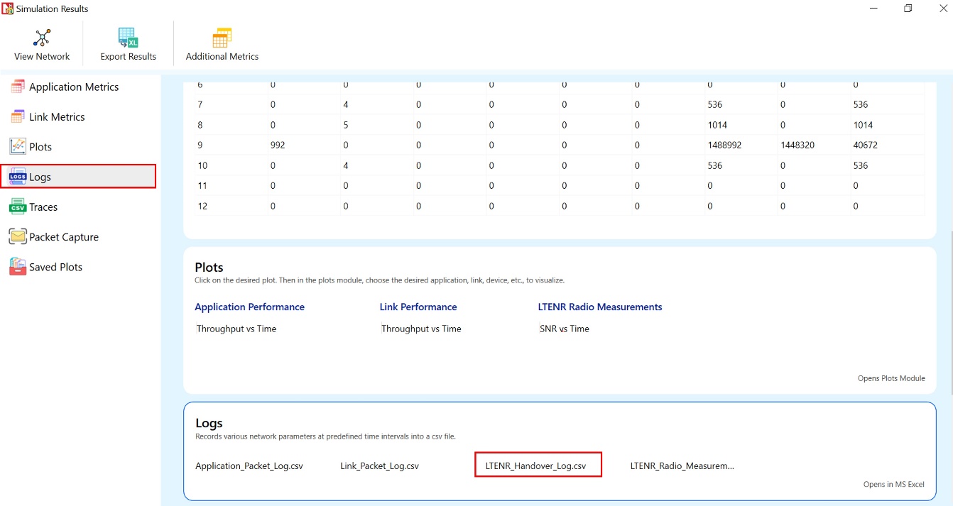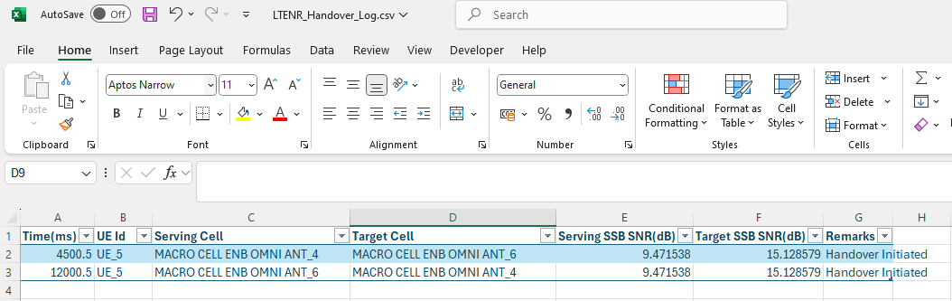 The NetSim Handover Log records events occurring during a handover. This includes the timestamp, UE ID, serving cell ID, target cell ID, Serving SSB SNR (dB), Target SSB SNR (dB), and Remarks (the time at which handover initiation and handover offset were met) when the TTT parameter is enabled. This log can be used to identify handover attempts and analyze the impact of TTT on handovers.