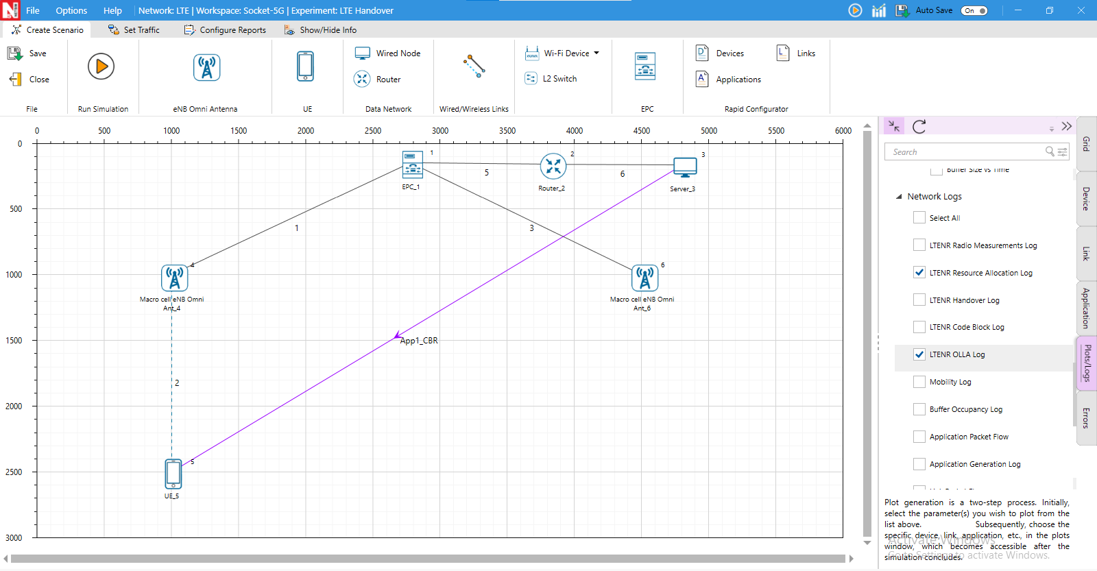 The LTENR OLLA log can be enabled by clicking on configure reports in top ribbon \(>\) Plots \(>\) Select OLLA log under Network Logs, as shown below.