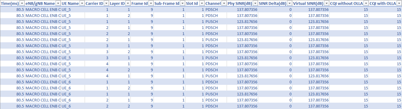 NetSim’s OLLA Log records parameters associated with Outer Loop Link Adaptation (OLLA) such as CQI with and without OLLA, PHY SINR, SINR Delta, Virtual SINR, etc. This log can be used to understand OLLA mechanisms in 5G.