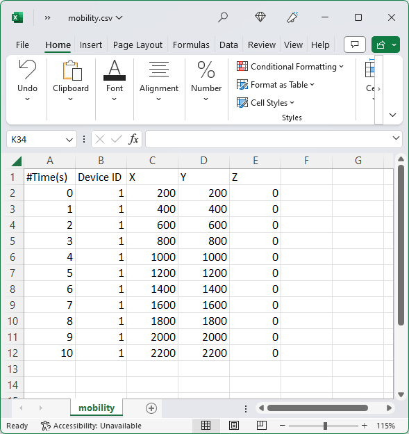 NetSim does not interpolate device mobility between two entries in the mobility file. This means that during the simulation the device “jumps” to the next point at that instant in time. Mobility is not “continuous” from one point to another over time. Continuous or fine-grained mobility can, however, be approximated by reducing the time interval between successive entries. Since Excel-based mobility files are supported, generating such fine-grained traces is straightforward.