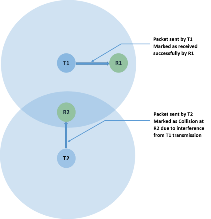 At the receiver, when a packet is being received, if the sum of the received power from all other nodes, except the node from where this packet is being transmitted, is greater than the receiver sensitivity then that packet is marked as collided.