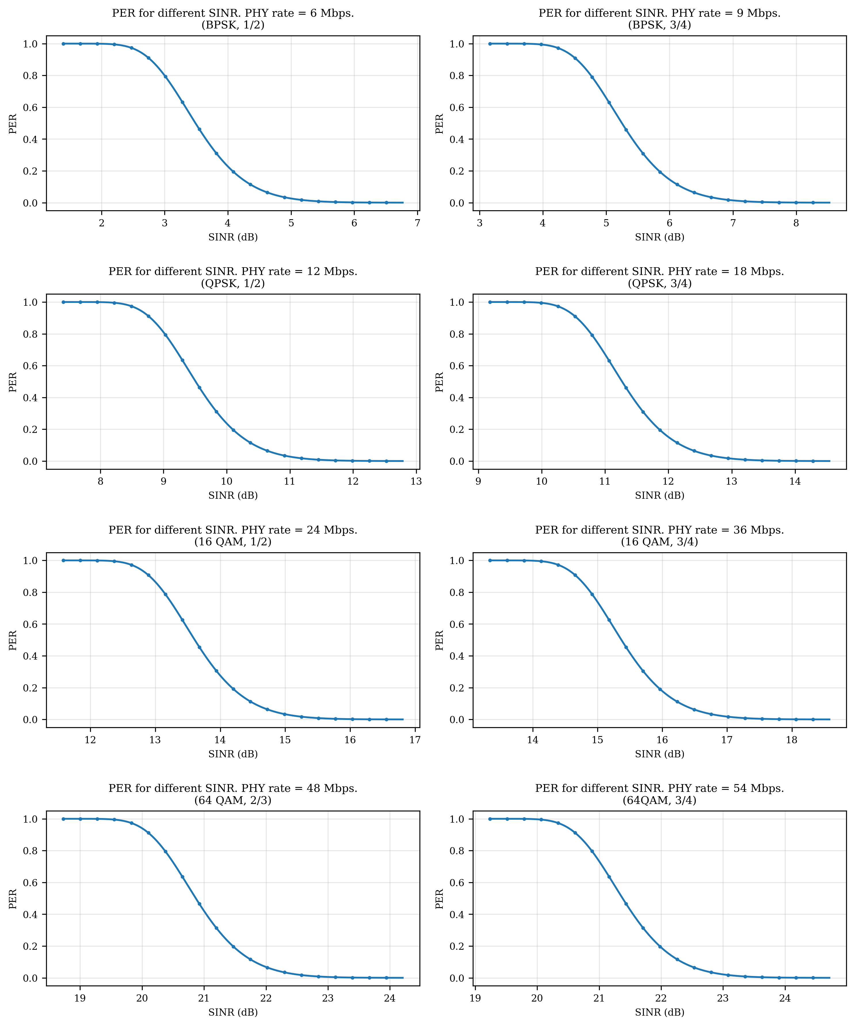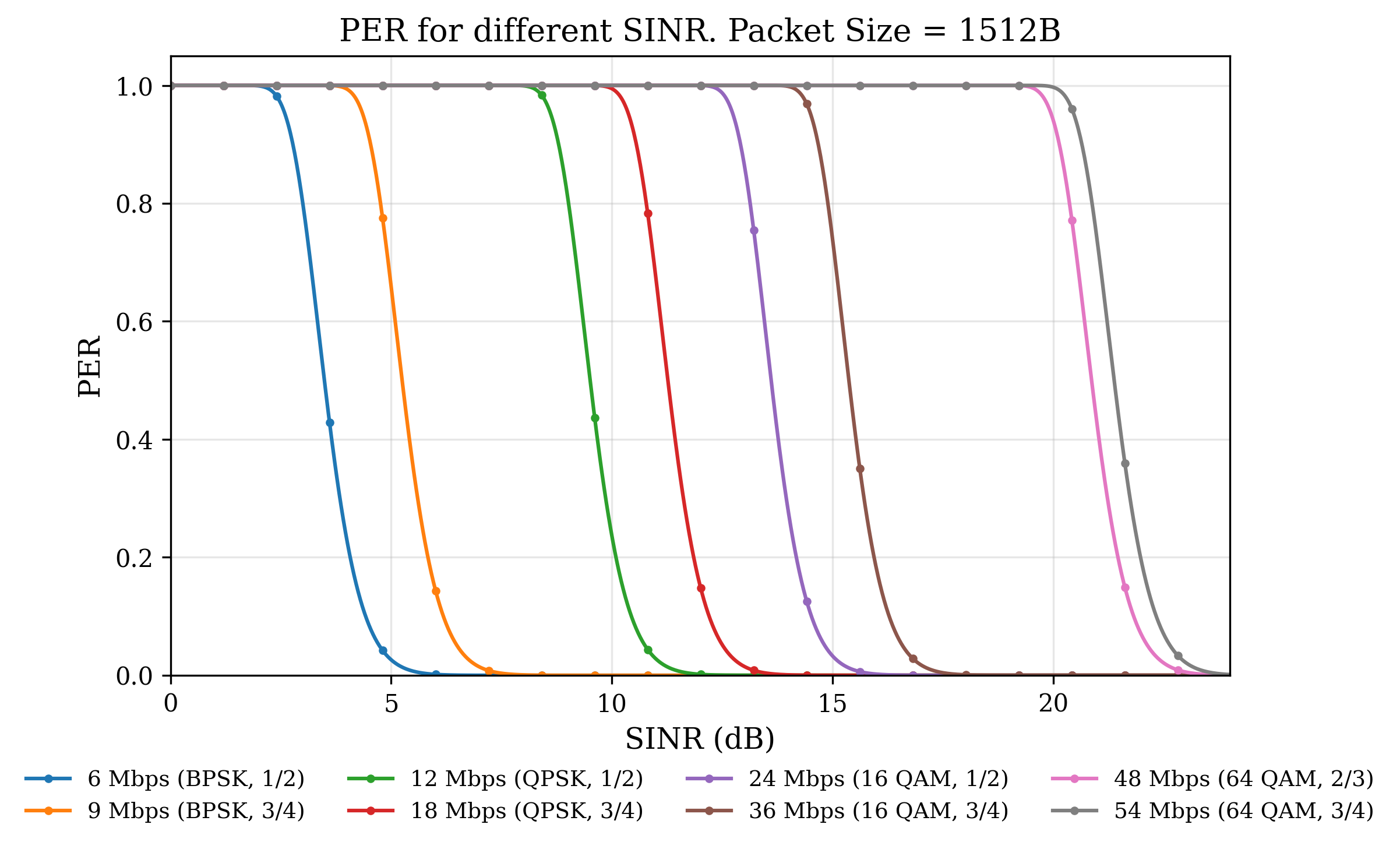 We get the BER by looking up the SINR-PER curves. Then \(PER = 1 - (1 - BER)^{L}\) where \(L = 1512 \times 8\). The Figure 4 plot was obtained from the NetSim function used to calculate BER in IEEE 802.11 Phy.c