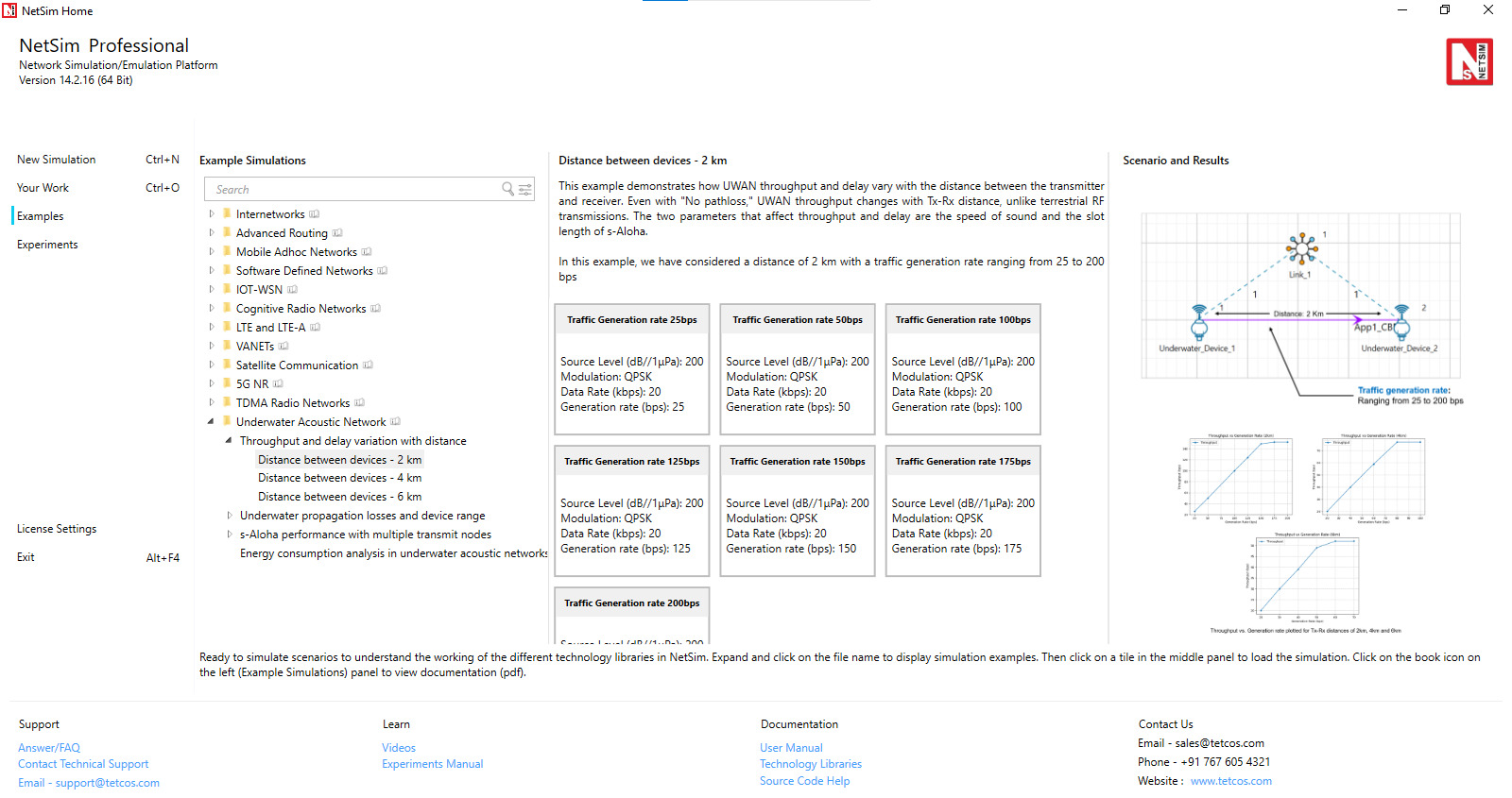 Open NetSim and Select Examples \(\rightarrow\) Underwater Acoustic Network \(\rightarrow\) Throughput and delay variation with distance and then click on the tile in the middle panel to load the example as Figure 1.