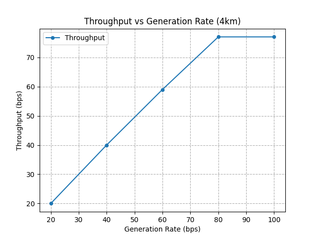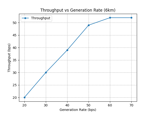 Peak throughput: The throughput reaches a maximum at an optimal load point (around 0.05–0.07 packets/sec). This represents the best balance between channel utilization and collision avoidance.