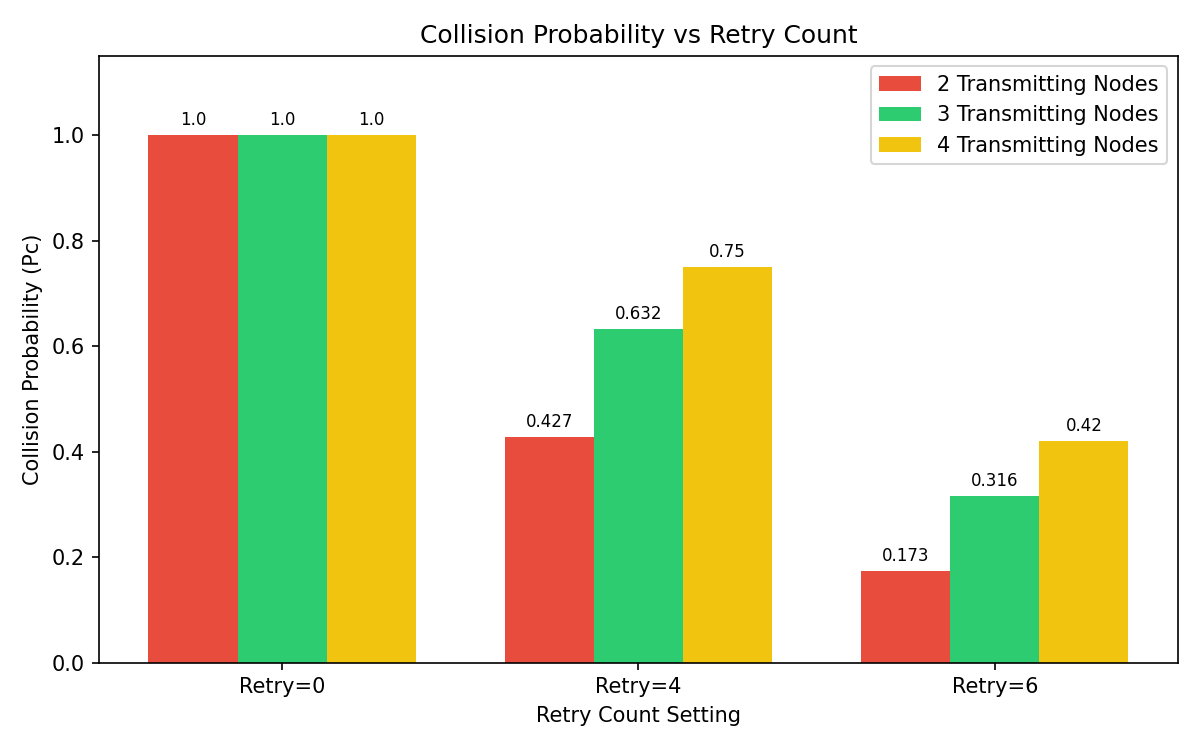 Sharp decline: As load increases beyond the optimal point, we see a sharp rise in collisions (from the collision plot). This leads to a rapid drop in throughput because: