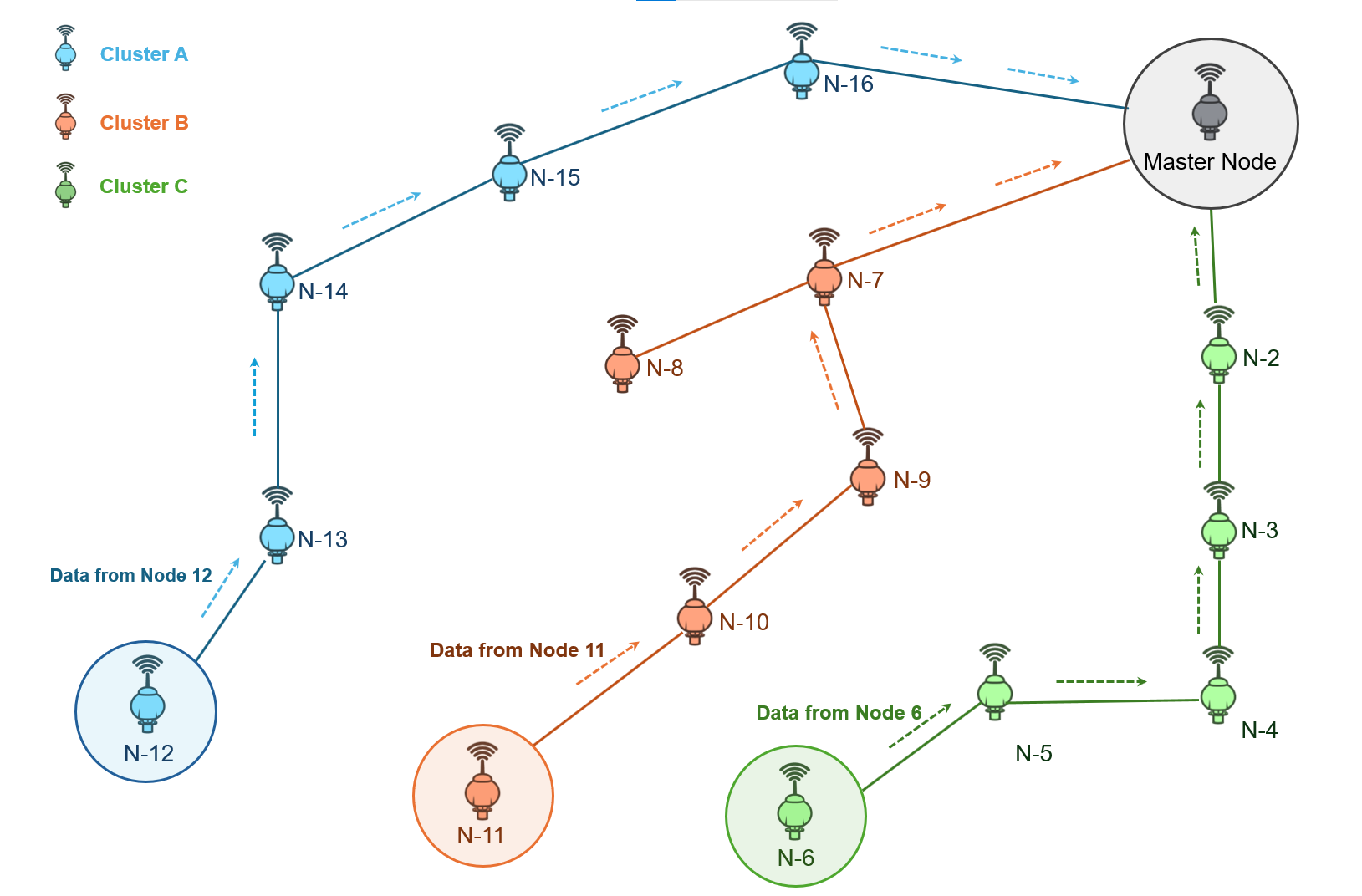 These plots reflect Node 7’s active role in relaying traffic from outer layers to the master node.